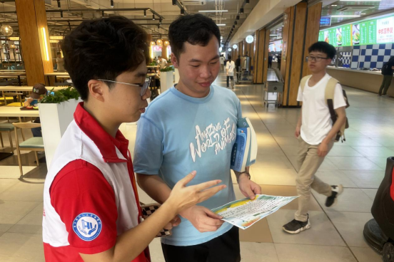 志愿者在学校食堂为学生宣传防火、防溺水安全知识