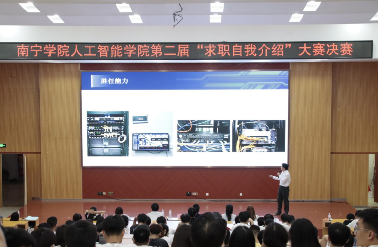活动伊始,主持人介绍出席比赛的嘉宾和评委老师,并介绍比赛的相关要求。随后,经过初赛和复赛角逐出来的14位选手进行决赛比拼,他们分别从基本情况、岗位认知、能力匹配、未来规划等方面进行自我介绍展示,向广大评委和观众展示他们自身独特的个性与魅力。经过激烈角逐,赖远荣荣获一等奖;杨翊坚、廖朝香、刘子铭荣获二等奖;郭鹏飞、韦栩生、劳翔、谢均亮、覃琳玲荣获三等奖;施炅圻、何俣霖、张爽、陈志威、韦朝乐荣获优秀奖。