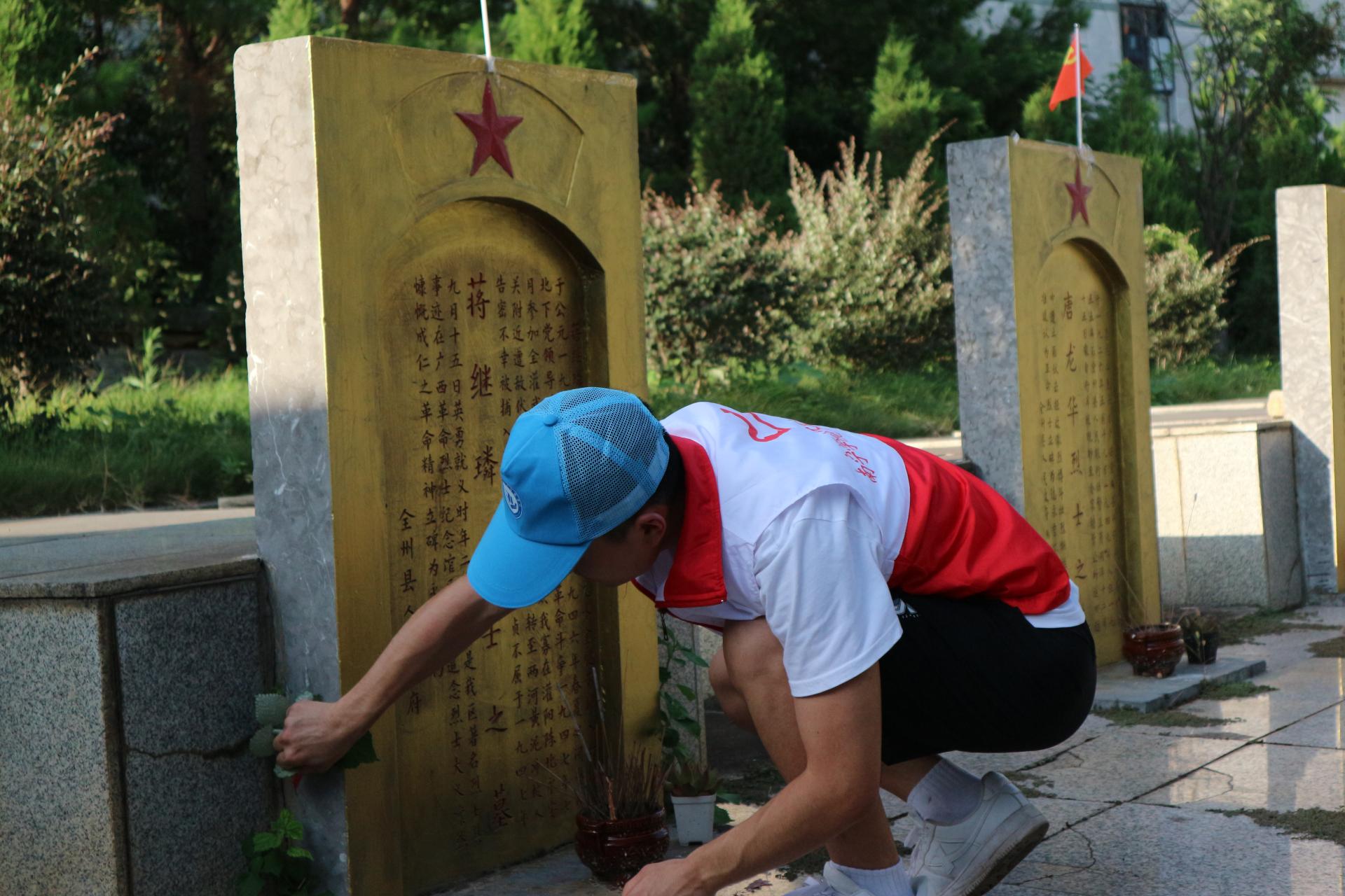 7月9日下午,服务团怀着悲痛而沉重的心情来到了凤凰烈士陵园,开起追寻革命足迹,缅怀革命先烈暑期 “三下乡”社会实践活动的第一站。凤凰烈士陵园安葬的都是在湘江战役中牺牲、或是生长于全州县并参与反内战、解放战争等战事活动的革命先烈。服务团瞻仰了先烈们的丰功伟绩,也被先烈们始终坚定理想信念,不畏艰难险阻,不畏牺牲的精神鼓舞和激励着。他们细心的清理革命先烈墓碑前的杂草,擦拭墓碑上的灰尘,整理墓碑上的党旗。最后,服务团全体师生向革命先烈们鞠躬默哀,感恩先烈,表达崇敬之情。