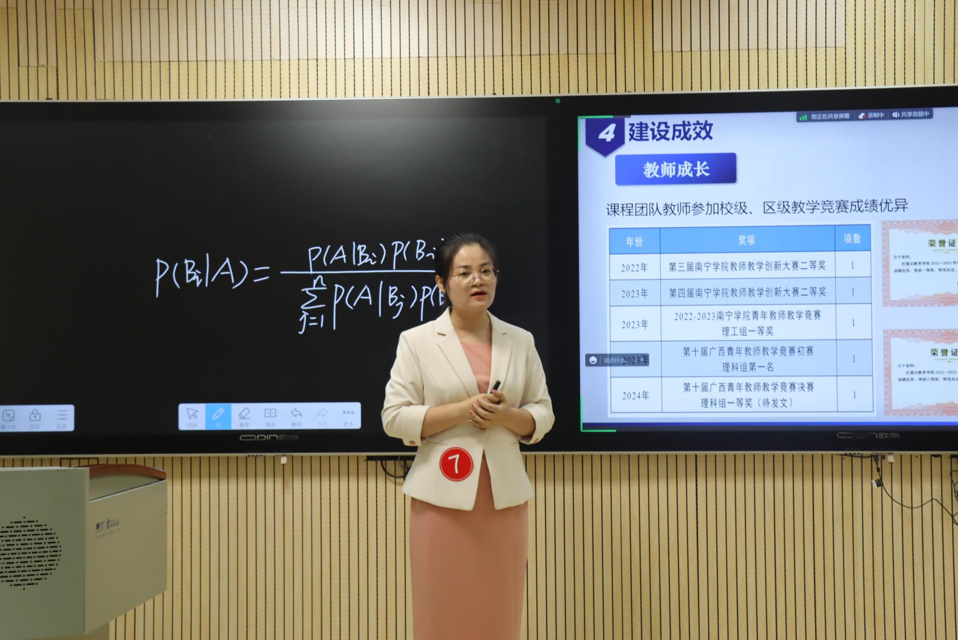 本届课程思政教学设计大赛决赛以现场教学和说课为主,要求参赛教师现场抽取教学节段,展示课程思政育人的新思路和新方法。在比赛中,吕宁老师所授《概率论与数理统计》课程巧妙将思政元素融入课程知识讲授中,实现知识传授、能力培养、价值塑造“三位一体”的教学目标,展现了其深厚的教学经验、卓越的教学能力和创新的教学思路,她的精彩表现脱颖而出,荣获一等奖。