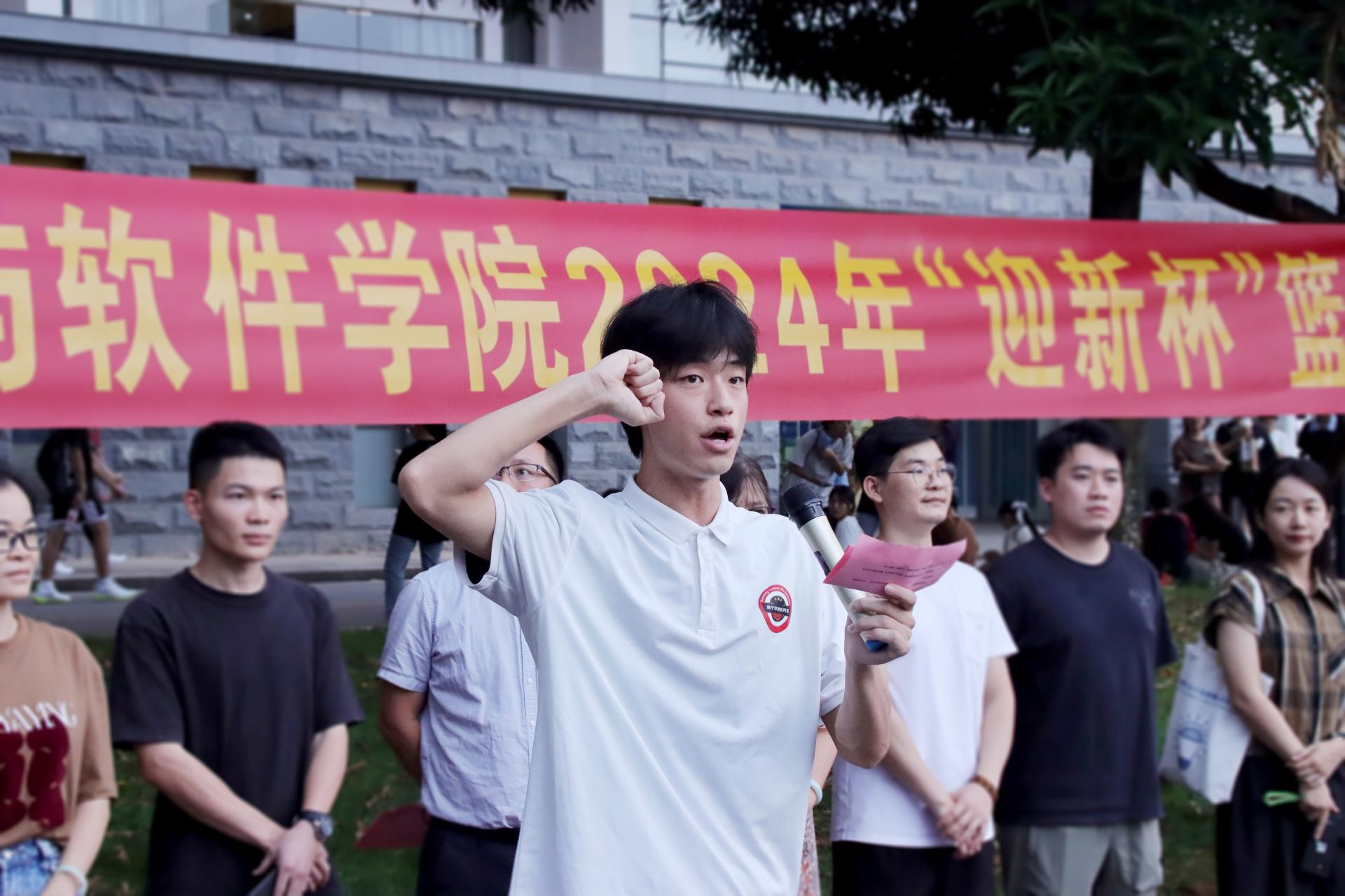 随后,“迎新杯”赞助商、21级智能科学与技术班的庞锡程同学发言。庞锡程同学首先预祝此次“迎新杯”篮球赛取得圆满成功,作为学长也希望学弟学妹们在比赛场上友谊第一,比赛第二,赛出风格,赛出水平,在青春的蓝图填上鲜活的色彩。