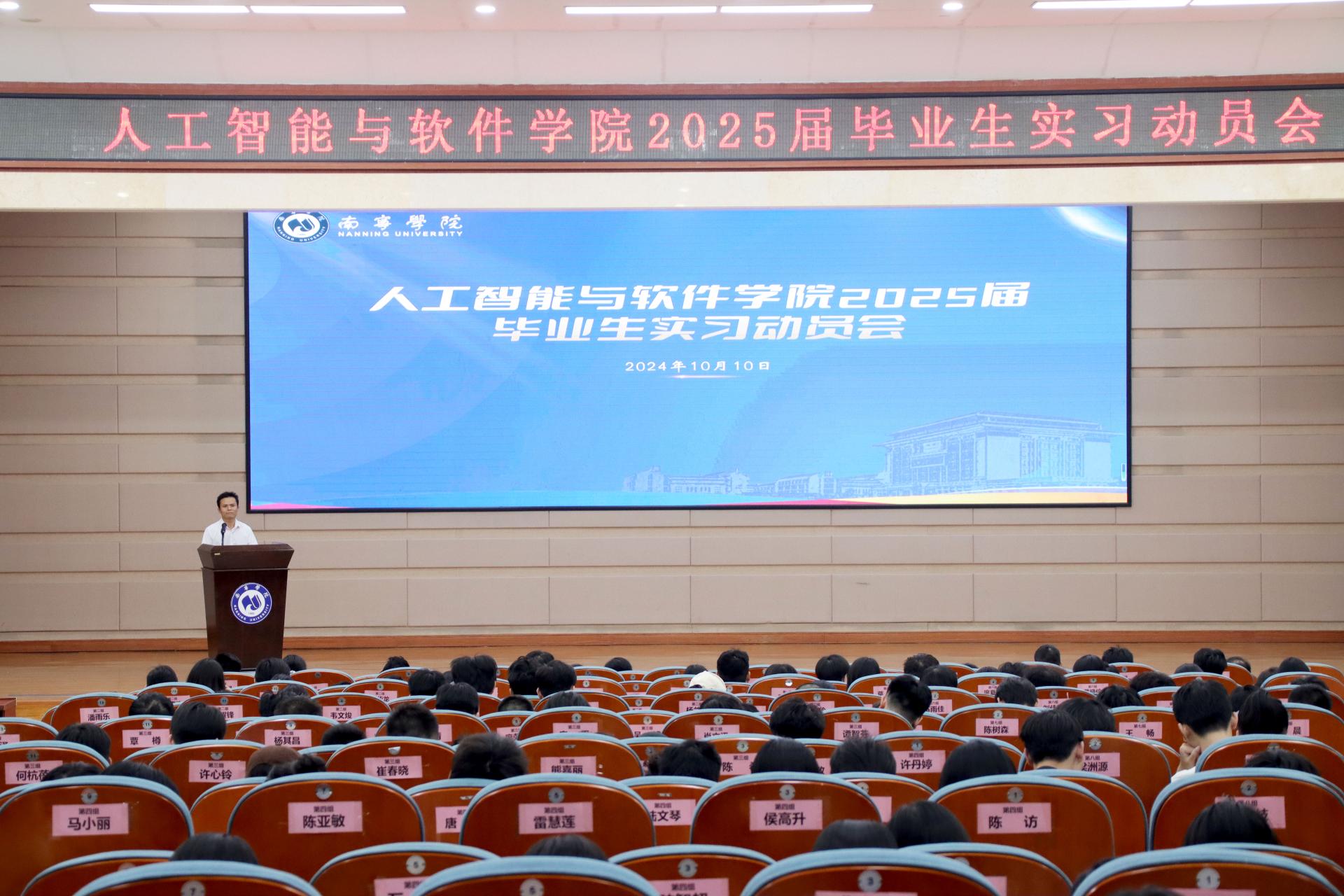 为有序推进2025届毕业生实习工作,引导毕业生树立正确的实习、就业观念,实现毕业生高质量充分就业。10月10日晚,人工智能与软件学院在图书馆报告厅召开2025届毕业生实习动员会。学院党委书记陆海兰、副院长卢志翔副教授、各教研室主任、各科室负责人以及2025届毕业生辅导员出席动员会,学院2025届全体毕业生参加动员会。本次会议由学生科科长梁信舅主持。