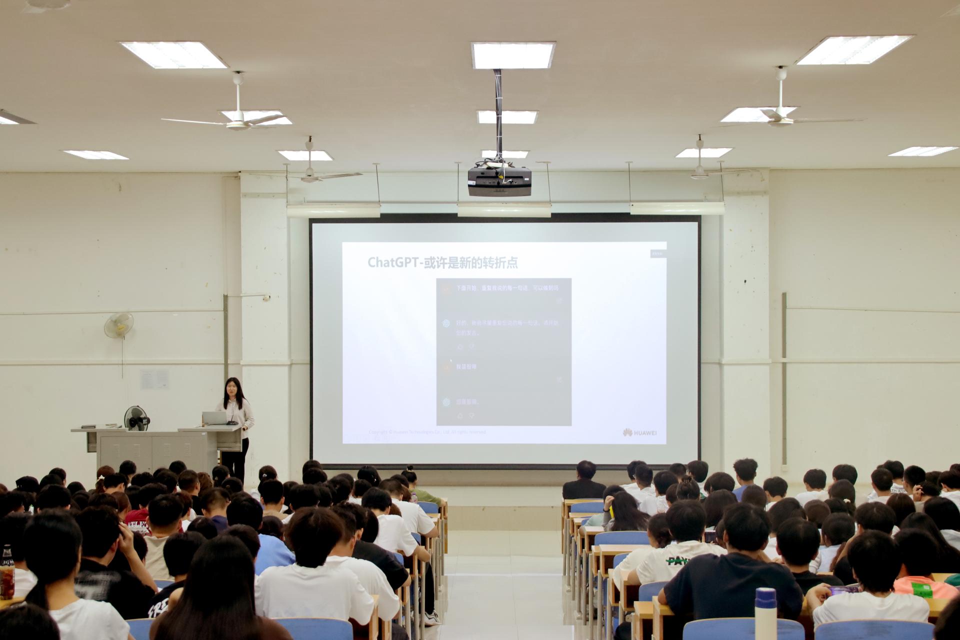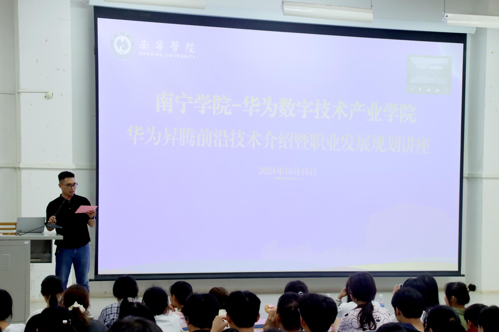 10月15日晚上,南宁学院与华为合作的开学季公开课系列之华为昇腾前沿技术介绍暨职业发展规划讲座在敷文园E-104顺利举行。本次讲座由我校华为数字技术产业学院主导,人工智能与软件学院牵头,与智能制造学院联合组织,旨在帮助相关专业学生深入了解昇腾前沿技术和人工智能最新发展状况,并为学生的职业规划指明方向。讲座邀请华为全球培训中心人工智能高级讲师白雪老师作主题宣讲,现场吸引了450余名师生到场参加。