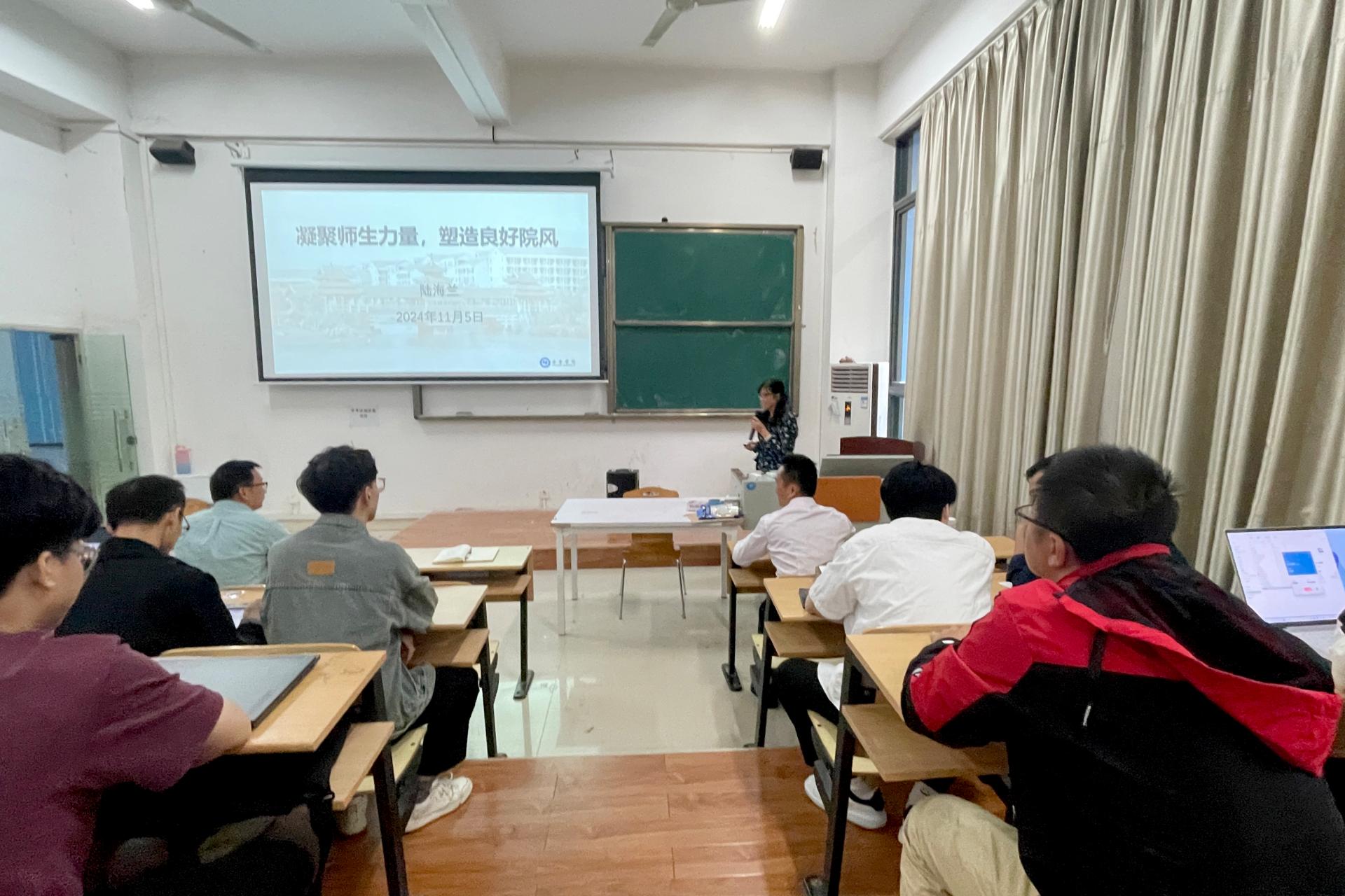 为贯彻落实学校关于校风建设指示精神,提升学院教师工作作风、教师教风和学生学风,落实立德树人根本任务,11月5日下午,人工智能与软件学院在智能楼102召开院风建设动员部署会。学院领导及全体教师参加会议,会议由学院党委书记陆海兰主持。