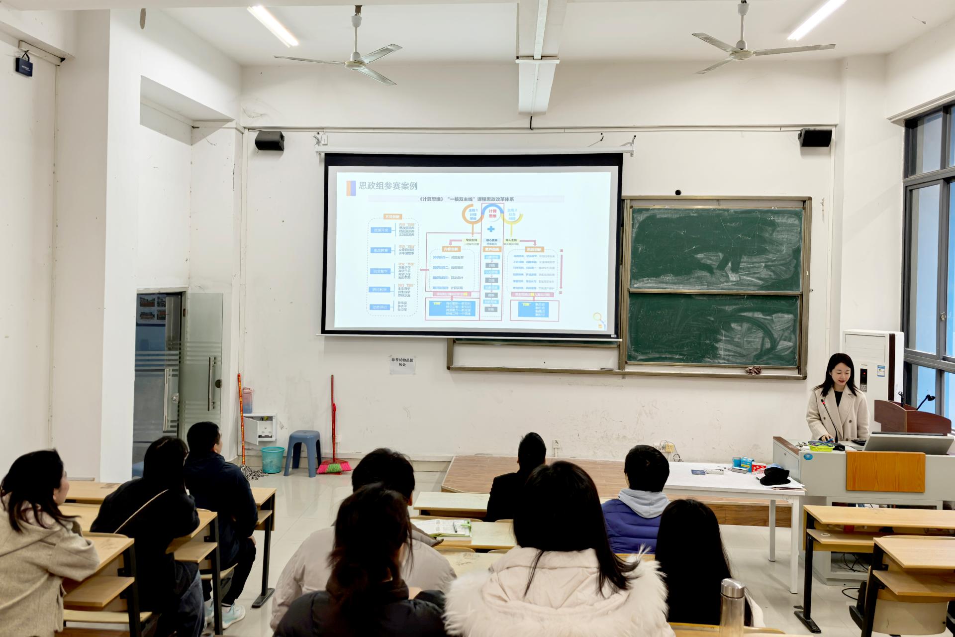 随后,团队成员陈飞老师对课程思政在教学创新大赛中的展现与获奖心得进行了分享。陈飞老师通过生动的案例、详实的数据和精彩的演示,展示了团队在课程思政元素挖掘、教学方法创新方面的实践成果,以及在教学创新大赛中如何将这些元素融入竞赛作品,最终取得优异成绩的过程和心得。