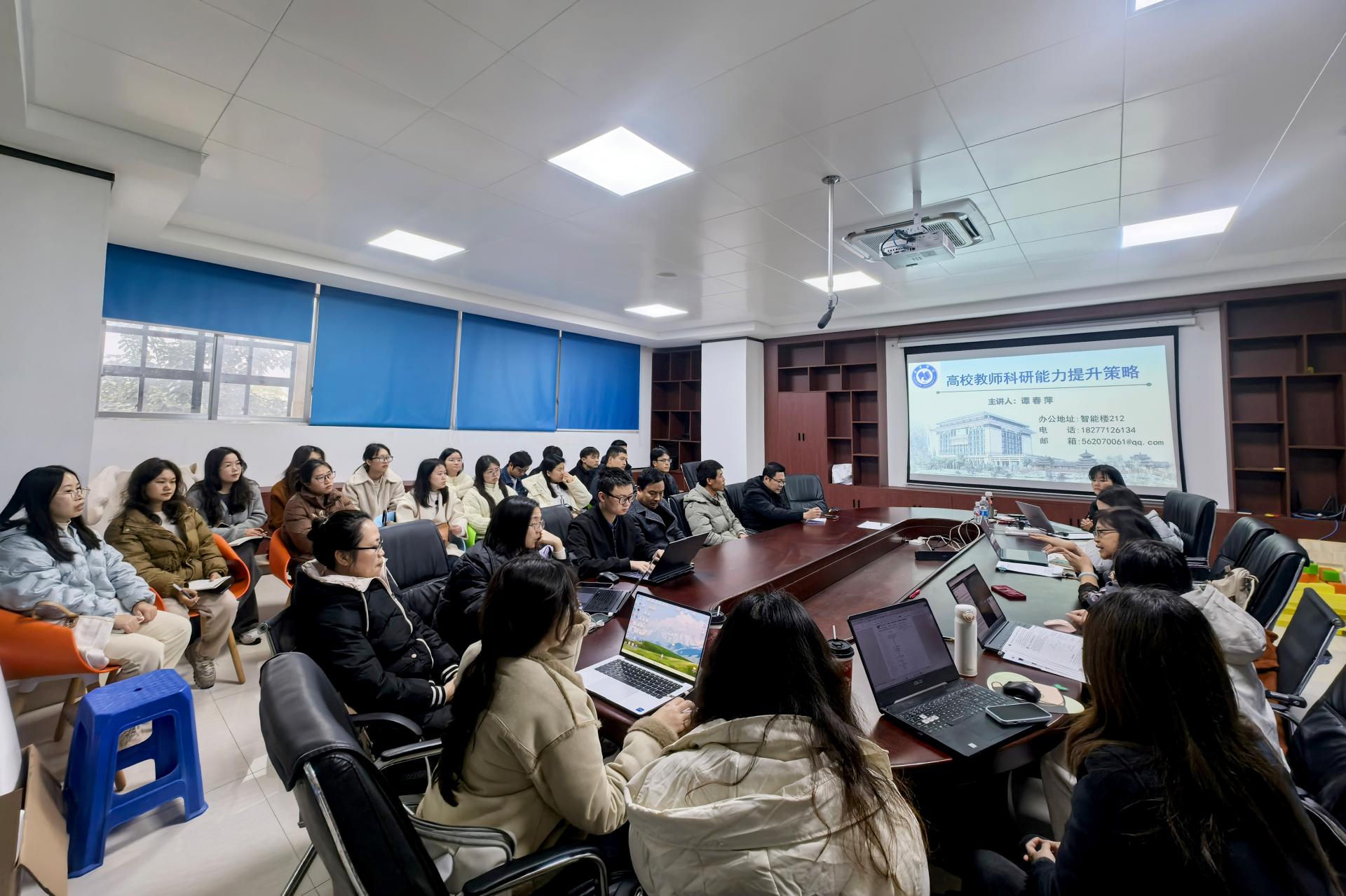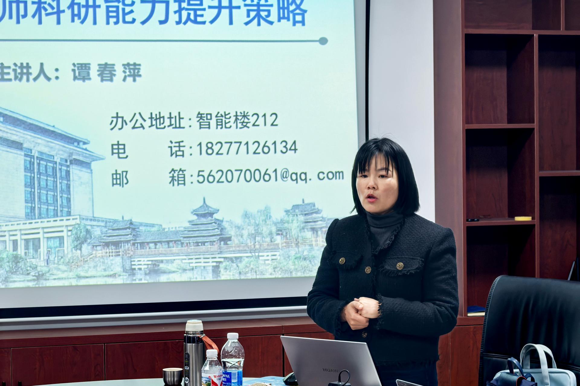 随后,学院科研与学科建设科负责人谭春萍教授作专题分享。谭春萍教授凭借个人的科研成长经历和丰富的科研管理经验,深入浅出地阐述了高校教师科研能力提升的有效策略。她从科研项目的选题、申报,到研究过程中的方法运用、团队协作,再到科研成果的撰写与发表,进行了全面而细致的讲解。在选题方面,谭春萍教授指出,教师应紧密结合学科前沿和社会需求,挖掘具有创新性和实用性的研究课题。在申报环节,她详细介绍了申报书的撰写技巧和注意事项,强调要突出项目的研究价值和可行性。关于研究过程,她强调团队协作的重要性,鼓励教师们打破学科壁垒,组建跨学科研究团队,共同攻克科研难题。