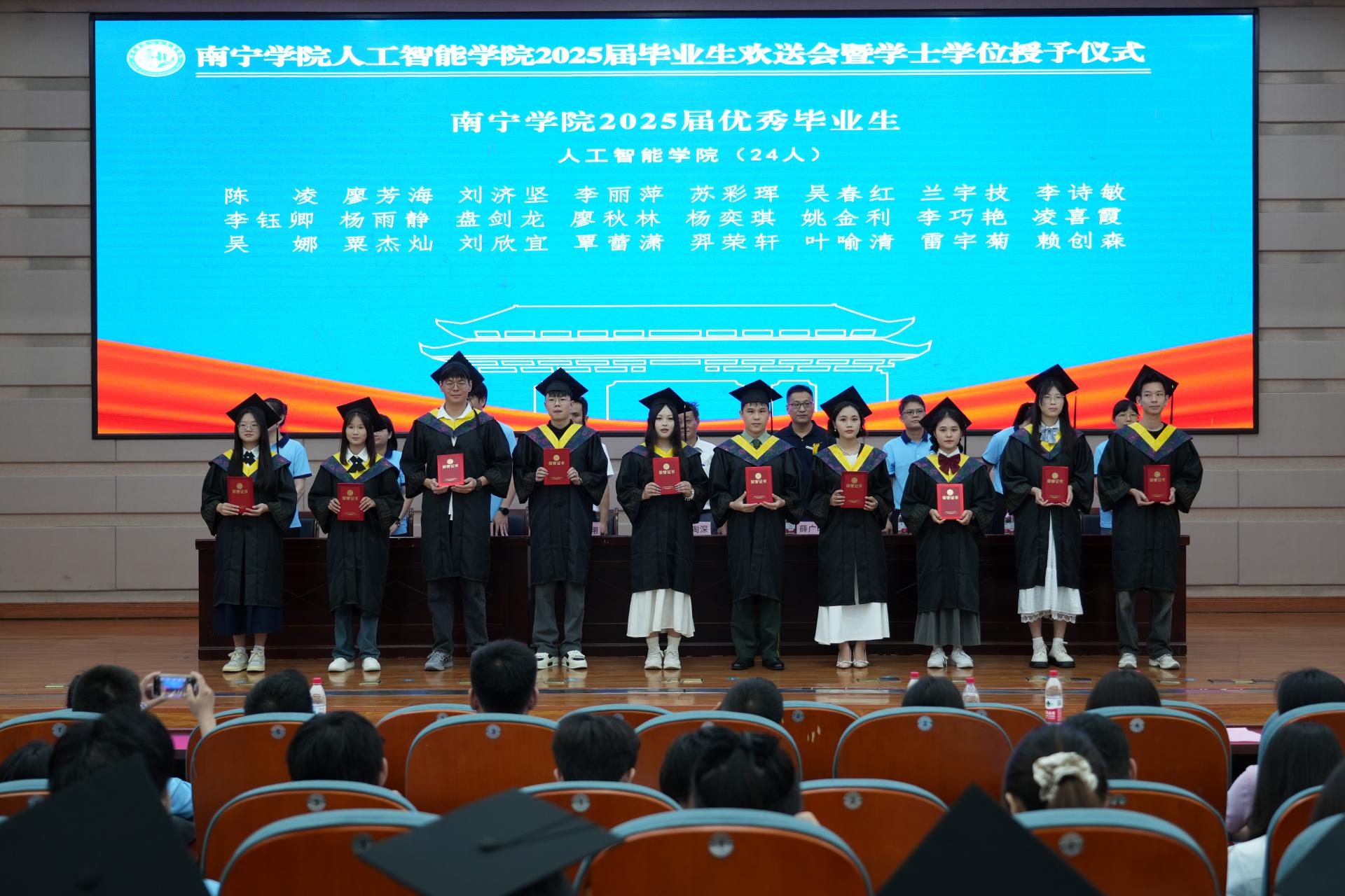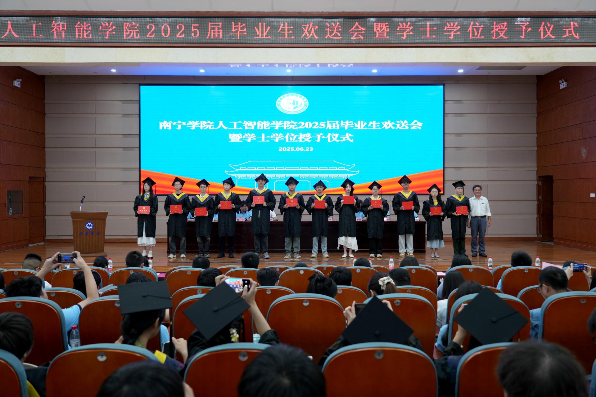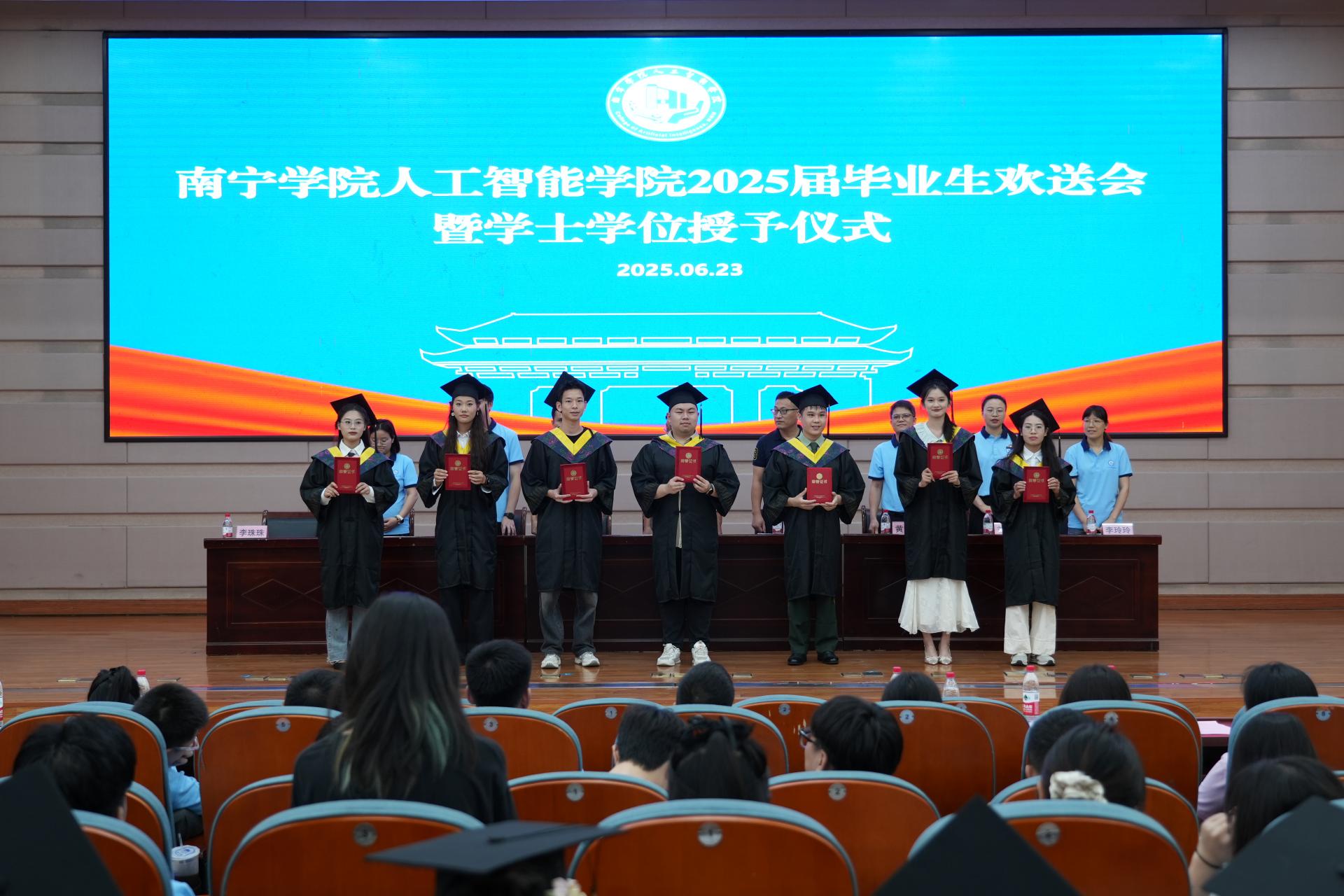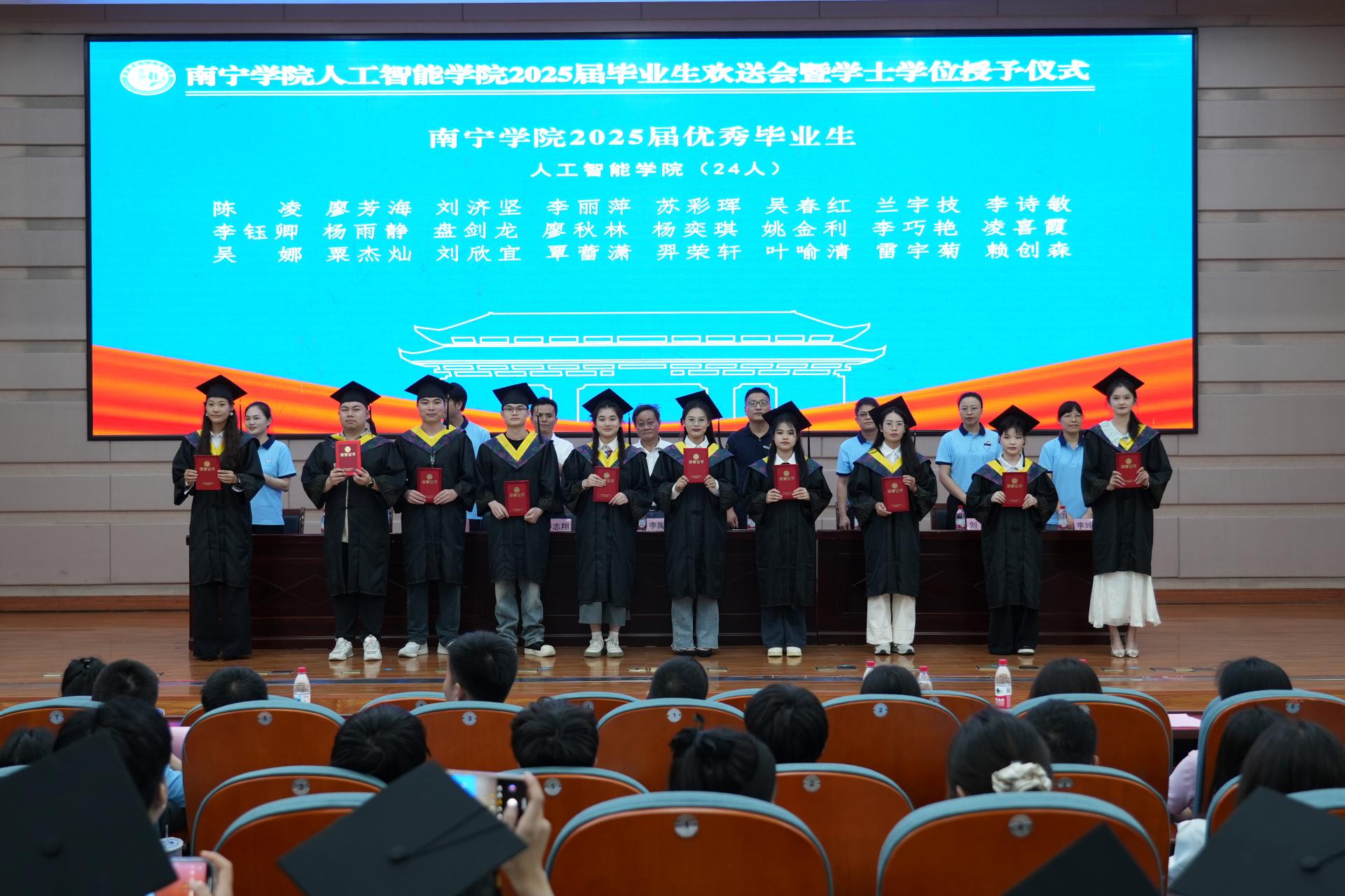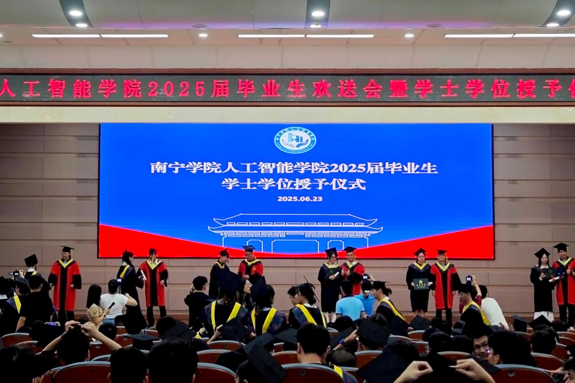 副院长薛广明教授宣读了南宁学院关于准予2025届全日制普通本科生毕业的决定。副校长、人工智能学院院长(兼)李陶深教授依次为各班级毕业生代表颁发毕业证书。
