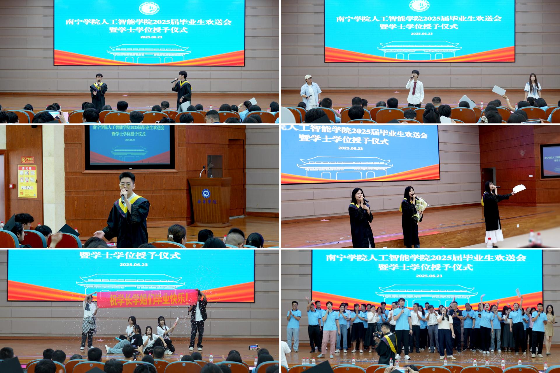 最后,副院长卢志翔教授宣读南宁学院关于授予2025届全日制普通本科毕业生学士学位的决定。学院副院长薛广明教授、副院长卢志翔教授、唐诗副教授、黄志昌副教授、刘敏副教授、麻时明副教授分别为2025届毕业生授予学士学位并合影。(人工智能学院传媒中心供稿 文/石芸溪 图/李世举、人工智能学院传媒中心)