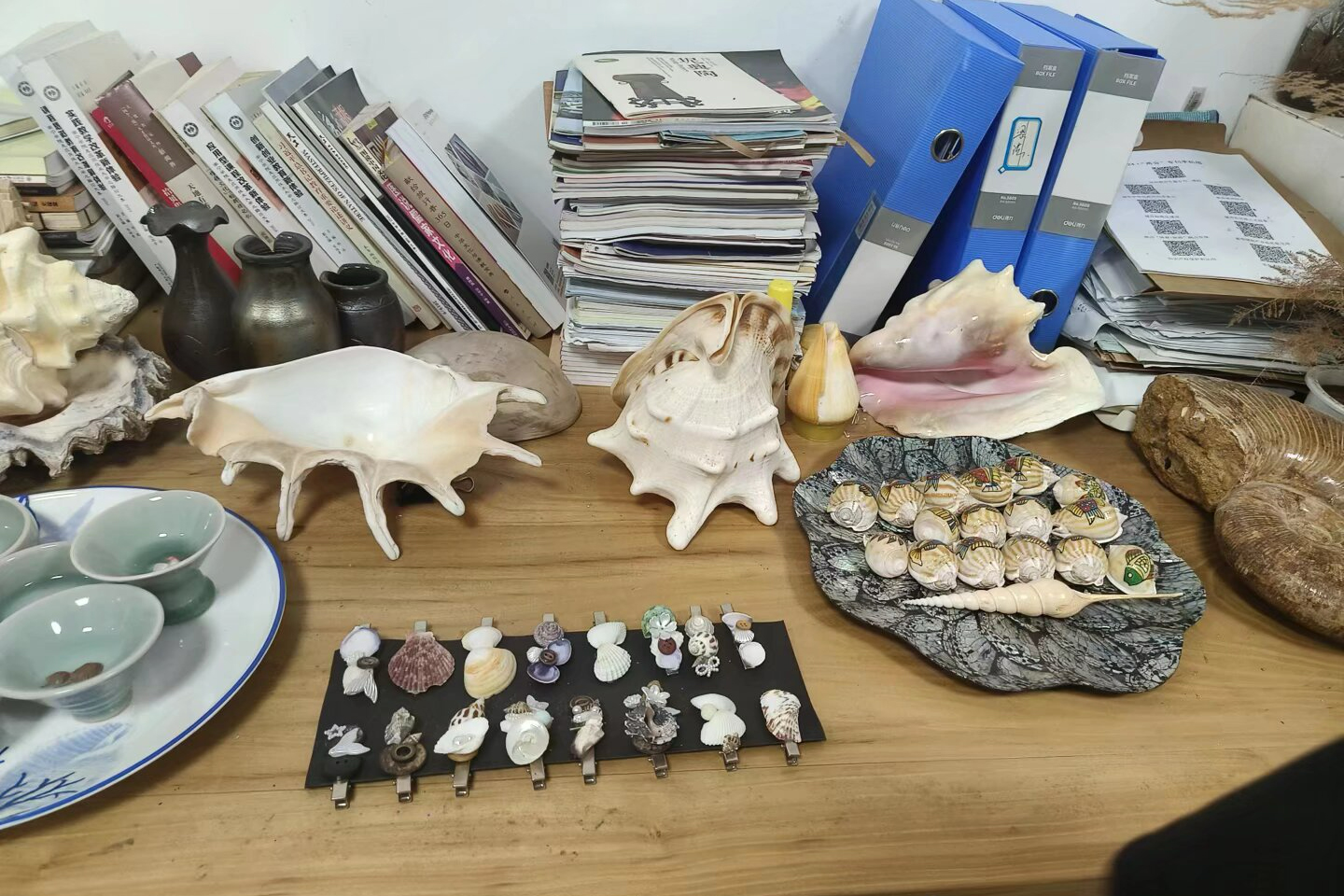 首先,实践团成员来到利成世大师的工作室,满桌的贝雕作品瞬间吸引了他们的目光,给予了强烈的视觉震撼。这些作品题材丰富多样,既有传统龙凤纹样,彰显着深厚的文化底蕴;又有现代海洋主题,洋溢着时代气息。每一件作品都巧妙地融合了贝壳的天然纹理与匠人的精妙构思,展现出独特的艺术魅力。