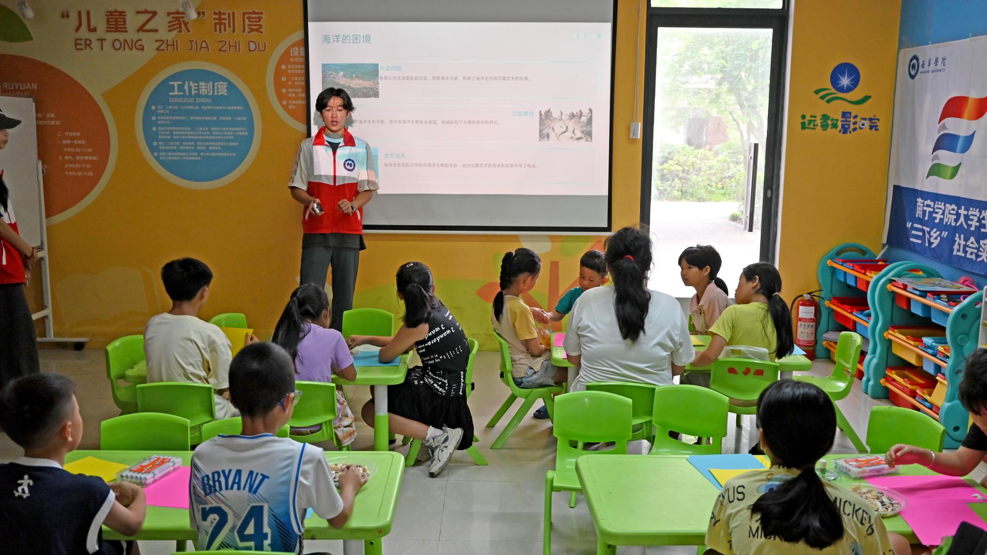 活动伊始,实践团杜惠杰同学以生动且易于理解的方式,引领孩子们开启了一场贝雕艺术的探索之旅。他从贝雕艺术的起源及其发展历程讲起,进而深入介绍其独特的艺术魅力,使孩子们对这一古老技艺形成了初步认知。随后,他通过列举具体案例并呈现直观数据,深入浅出地阐述了海洋污染的现状,以及垃圾分类在保护海洋生态过程中的关键作用。此外,他还详细讲解了正确处理海滩垃圾的方法。为增强活动的互动性与趣味性,在互动问答环节,小朋友们积极踊跃地参与答题,争当环保小达人。答对的小朋友还获得了精美的小礼品,现场氛围热烈异常。
