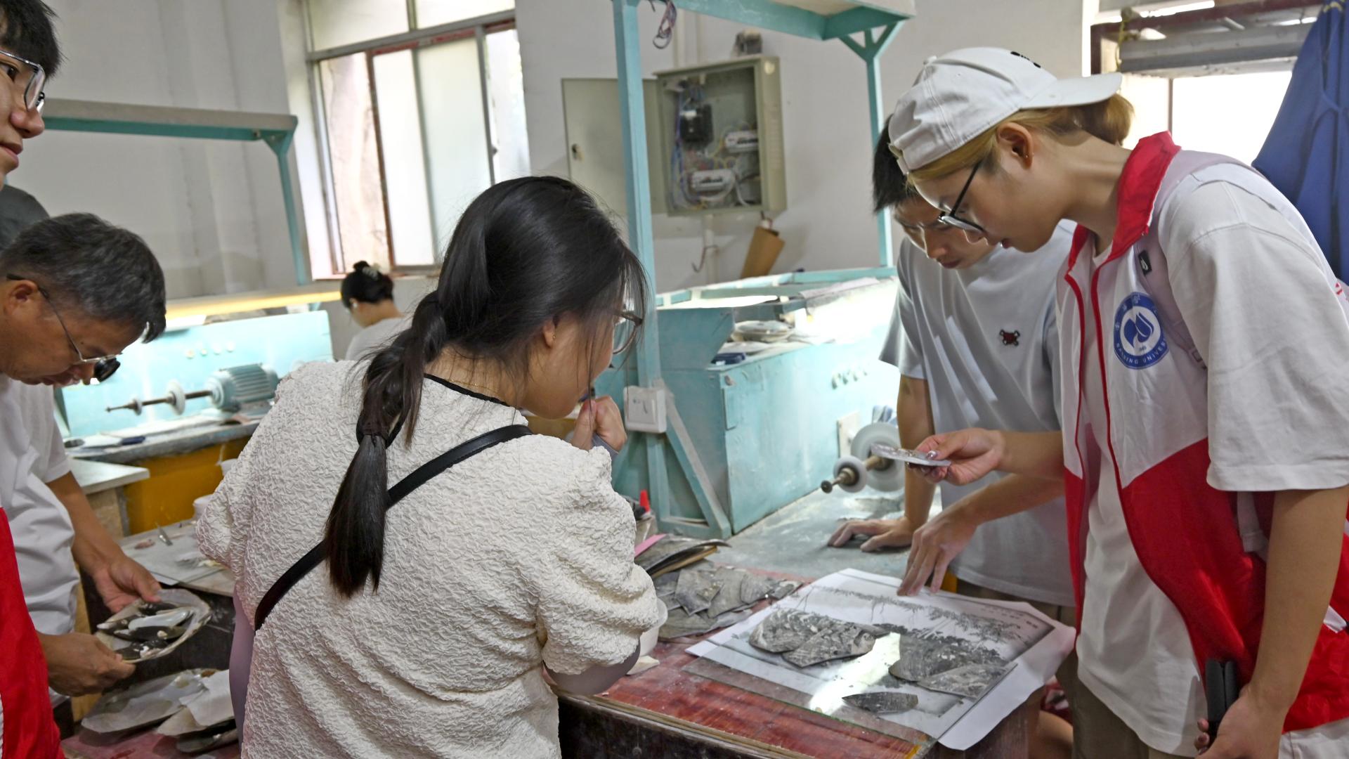 下午,为更深入地了解贝雕制作工艺,实践团在中国工艺美术大师利成世的引领下,前往恒兴珠宝有限公司贝雕制作工作室开展深入调研。在工作室,实践团成员近距离观察了专业的贝雕制作环境与工具,了解到贝雕工艺品从画稿、选料、磨型、抛光、粘贴、装裱的整个制作流程,深切体会到,每一件精美的贝雕作品背后,都凝聚着工匠们无数的心血与汗水。