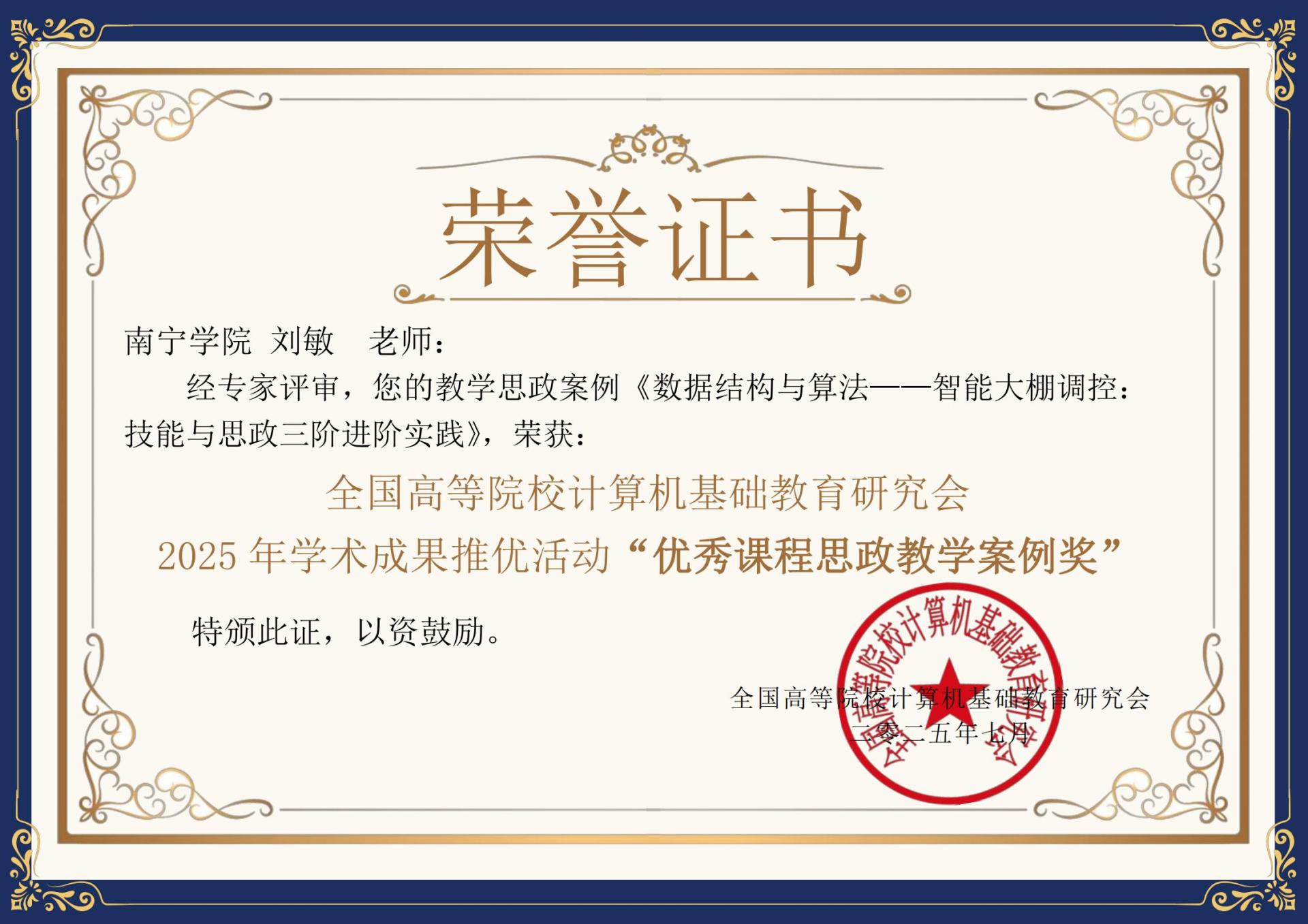 年会期间,同步举办了2025谭浩强计算机教育基金颁奖仪式,奖项涵盖杰出教师奖、优秀教师奖、新星教师奖及优秀学术成果奖等多个类别,旨在嘉奖行业内的卓越典范与杰出成果。在竞争尤为激烈的优秀学术成果奖评选中(全国仅设10个名额),我院刘敏副教授的课程思政教学案例历经多轮严格评审,最终突出重围,荣获“优秀课程思政教学案例”奖。