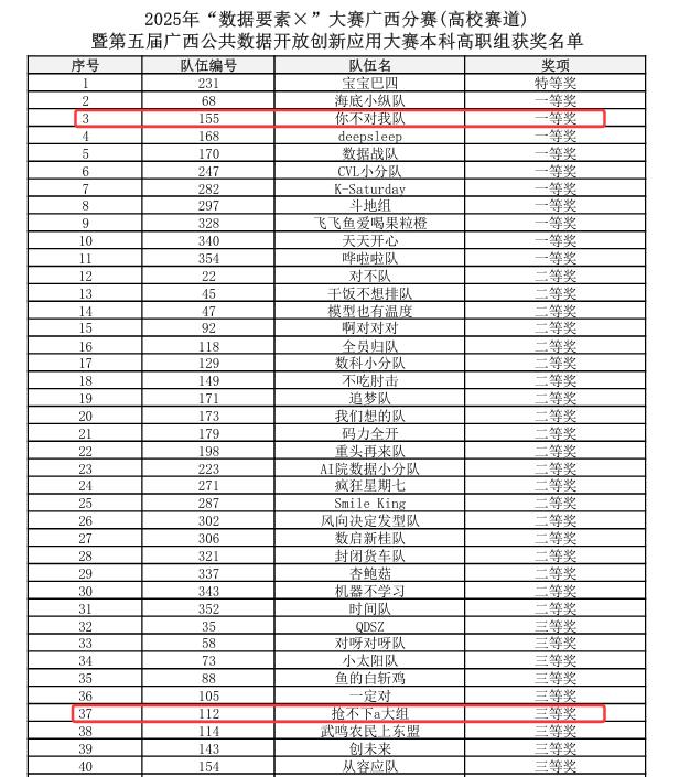 9月27日,由广西壮族自治区大数据发展局、自治区教育厅联合主办的2025年“数据要素x”大赛广西分赛(高校赛道)暨第五届广西公共数据开放创新应用大赛圆满收官,人工智能学院学子大赛中荣获一等奖一项,三等奖一项。
