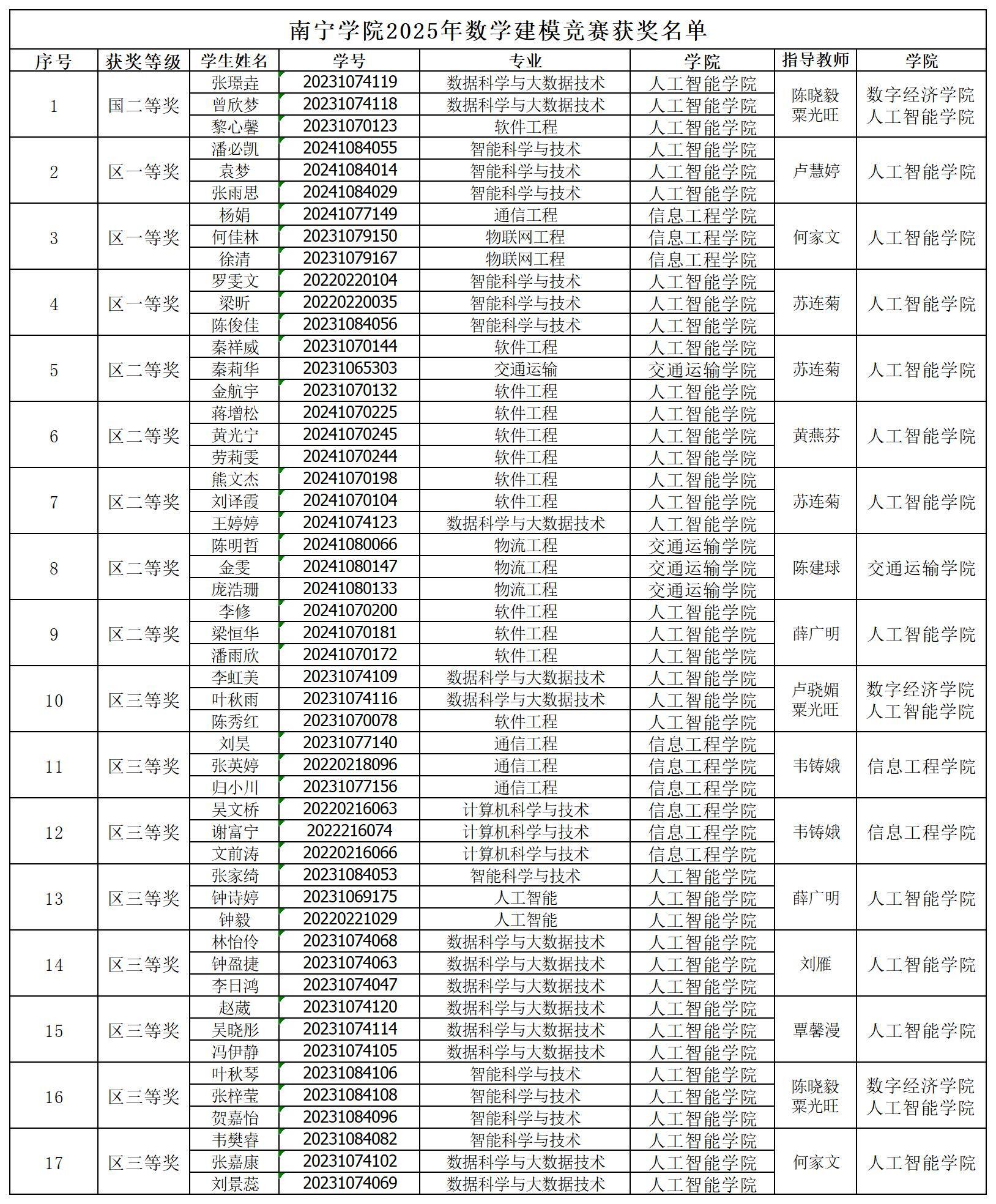 近日,2025 年全国大学生数学建模竞赛国赛及广西赛区结果相继揭晓,南宁学院在人工智能学院牵头组织下斩获历史性成绩。其中,国家级二等奖 1 项,广西赛区一等奖 3 项、二等奖 5 项、三等奖 8 项,创下学校升本来国赛和区赛综合最佳战绩;同时首次获评广西赛区 “优秀组织单位”,陈晓毅老师入选 “优秀指导教师”名单。