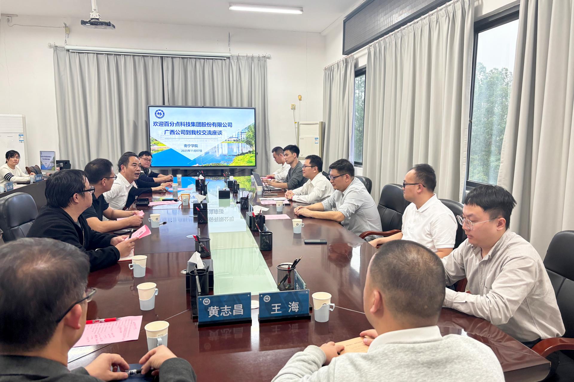 11 月 7 日下午,广西百分点科技有限公司联合广西联通相关负责人一行到访南宁学院,在行政楼 518 会议室举行合作交流座谈会。校长李栋学、科研与学科建设处处长张艳雯、信息化处处长沈艺敏、人工智能学院副院长(主日持常工作)薛广明、各教研室主任、专任教师代表,以及广西百分点科技总经理黄绍庭、集成事业部总经理马国民、南宁联通产业研究院副院长郭李帅等政企代表共同参会,三方围绕学科建设、实践教学、科研转化及东盟市场合作等议题进行磋商,达成多项共识。