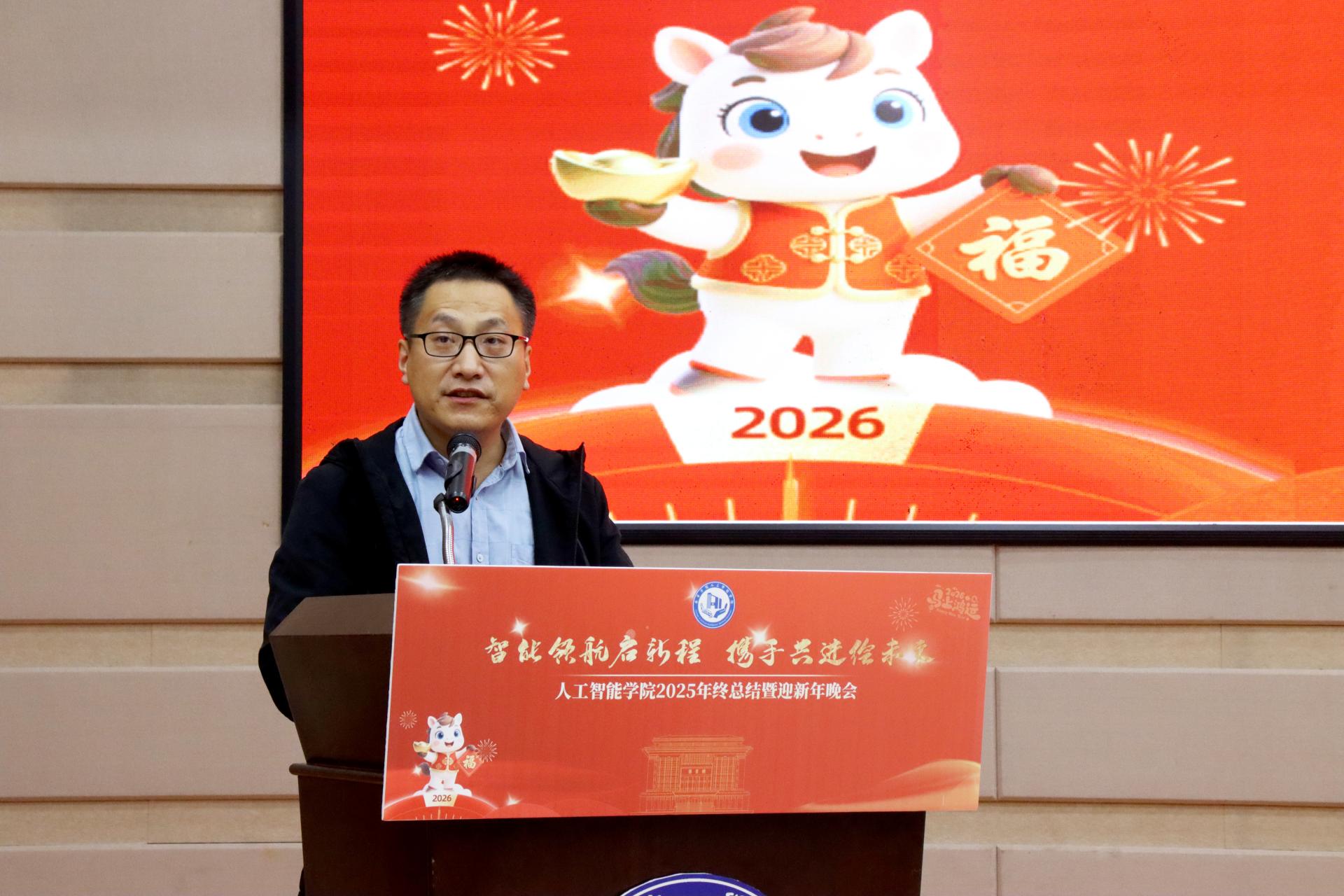 晚会伊始,学院副院长(主持日常工作)薛广明作2025年度工作总结。薛广明副院长代表学院领导向全院师生致以新年的问候和美好的祝愿,对这一年来获奖的集体和个人表示衷心祝贺,对为培育学生勤奋工作在教学、管理第一线的老师表示衷心感谢,对为学院的工作给予大力支持的学生干部及全体同学表示最诚挚的谢意。他回顾2025年,学院紧紧围绕学校教育教学审核评估任务与申硕核心目标,在创新创业实践、专业技能竞赛、文体活动等一系列活动中取得的突出成绩,生动展现了全院师生锐意进取、踔厉奋发的年度风采。薛广明副院长强调,全院师生要锚定“应用型人才培养”目标,提升教育教学与科研水平,推动学院在人工智能领域的创新发展,凝心聚力,携手奋进,在2026年开创学院发展新局面。
