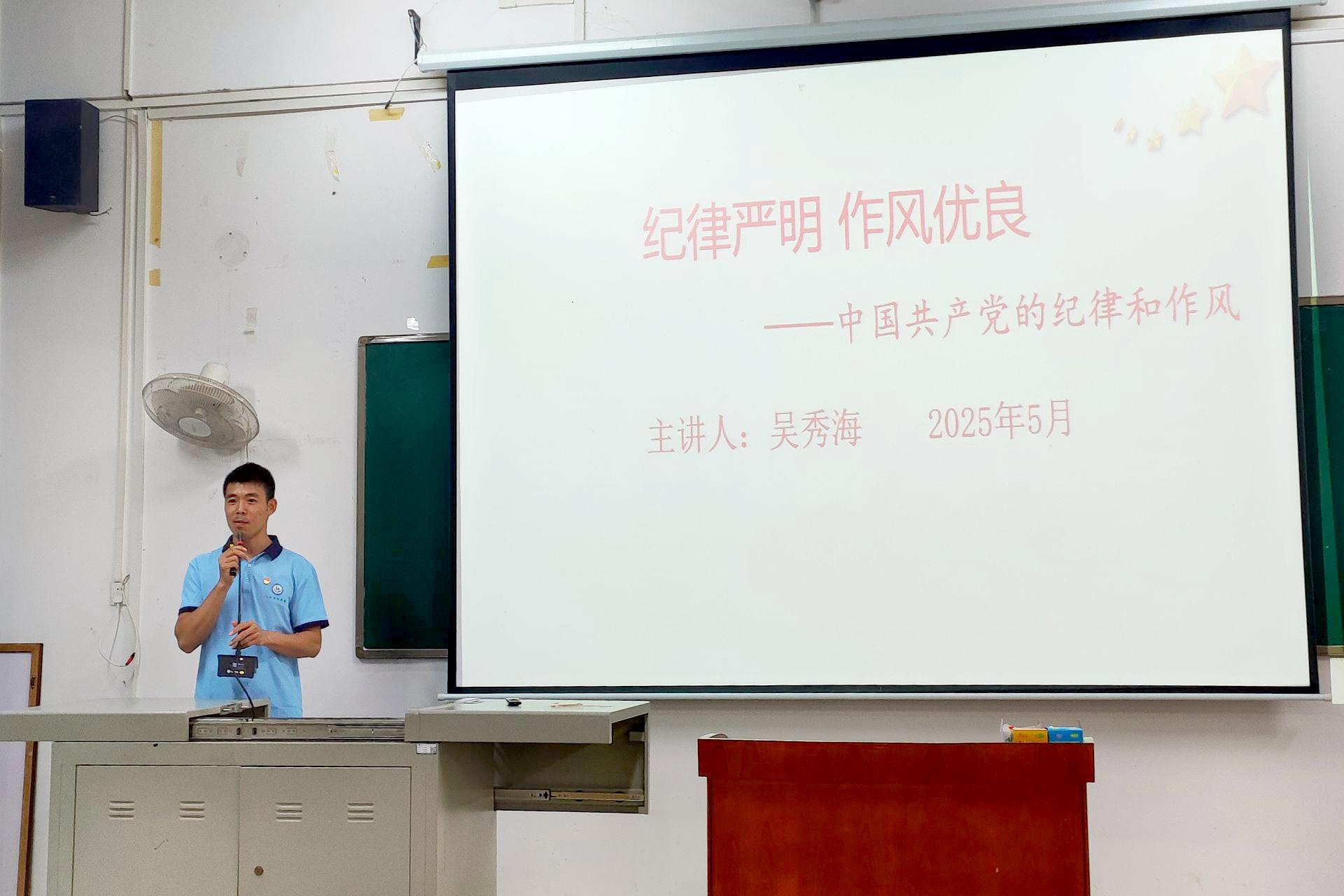 第四讲,学生第四党支部书记吴秀海同志以“党的纪律严明与作风优良”为主题,深入浅出地进行了授课。吴秀海同志明确指出:“纪律乃党的生命线”,并对政治纪律、组织纪律等六大纪律体系进行了详尽的阐释。他进一步强调,纪律严明与作风优良是党员不可或缺的品质,它们相互依存,共同构成了党保持坚强战斗力和强大凝聚力的关键保障。
