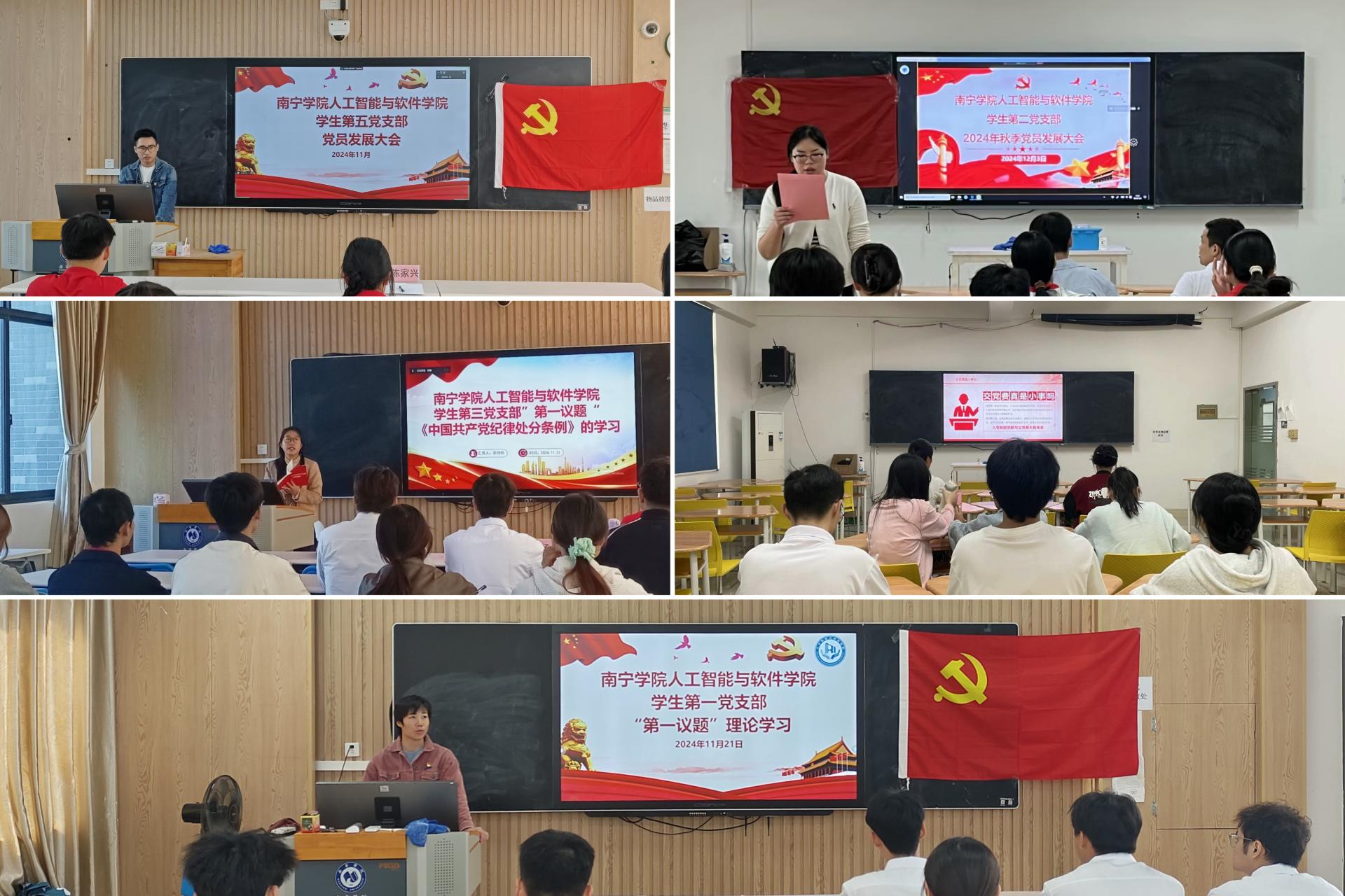 注入新鲜血液,培养新党员,使党焕发新的生机与活力,2024年11月下旬至12月初,人工智能与软件学院学生第一党支部、第二党支部、第三党支部、第四党支部、第五党支部分别召开了党员发展大会。本次大会由各学生党支部书记韦双妮、余建明、梁肖杨、吴秀海、陈家兴主持,各支部党员发展对象悉数列席,且超过半数的党员同志到场参加。