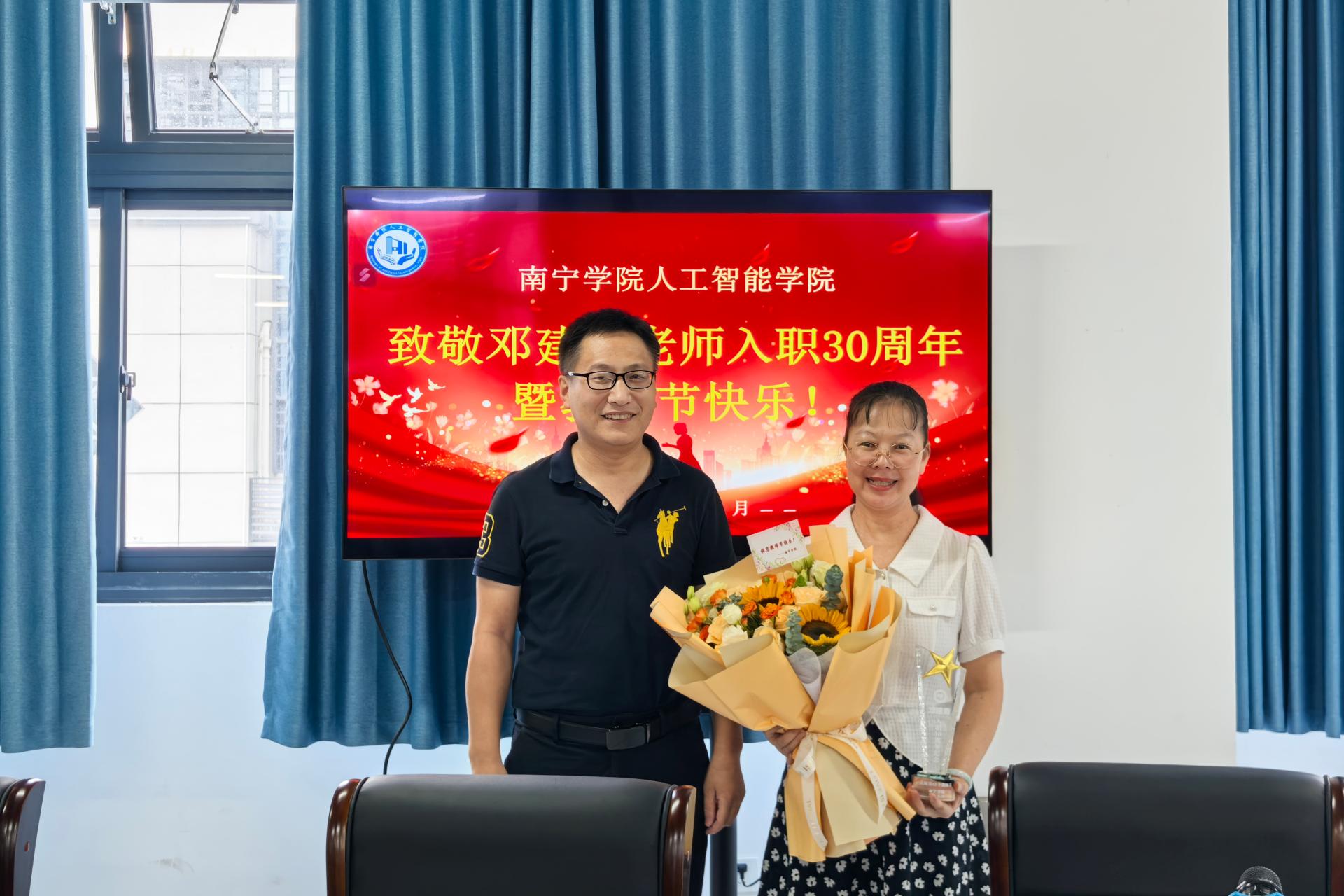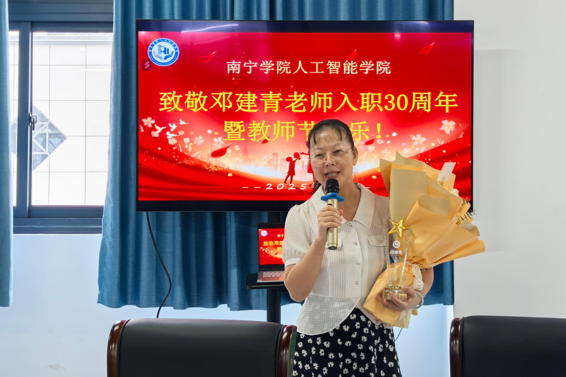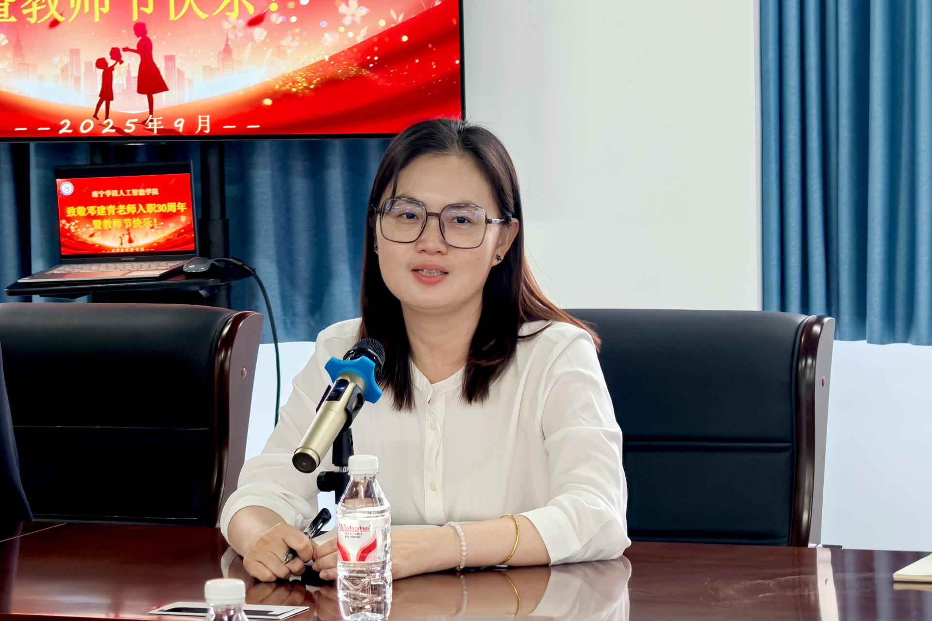 座谈会尾声,全体人员共同庆祝学院邓建青老师入职30周年,薛广明副院长对邓建青老师在教学、科研及帮扶青年教师方面的突出贡献给予高度赞扬,邓建青老师也分享了自己多年来的教学生涯感悟,真挚的话语引发在场教师共鸣,现场氛围温馨融洽,为此次座谈会画上圆满句号。(人工智能学院供稿 文/黄艺 图/陈家兴)